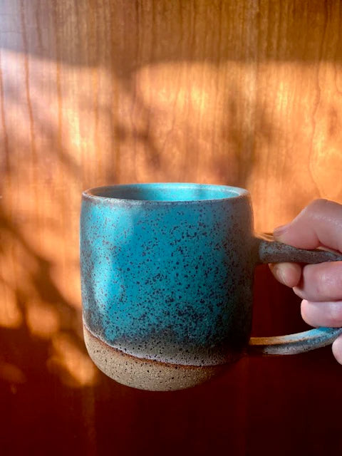 Enjoy a cup of coffee or tea in this wheel thrown, completely handmade mug made with speckled stoneware clay and fired with an aqua blue matte glaze.