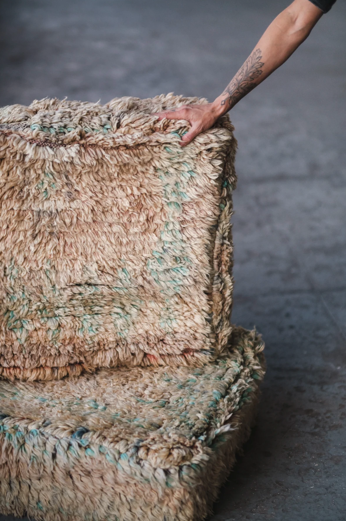 All floor cushion are made from recycled rugs making them not only stylish but eco-friendly. Each one is woven with traditional Berber symbols in the Atlas mountains of Morocco. If you find one you love, snatch it up, there is only one like it!