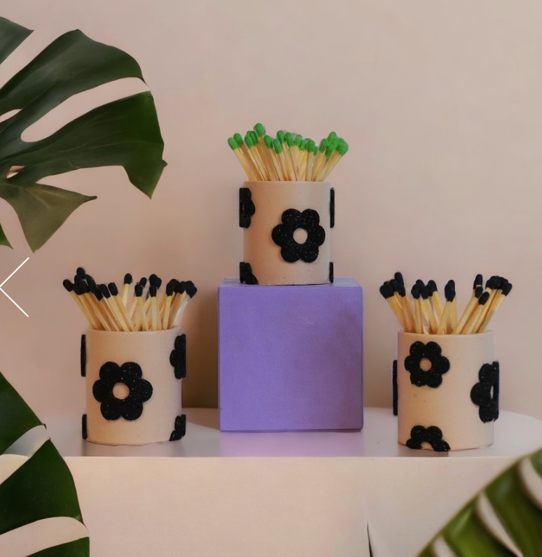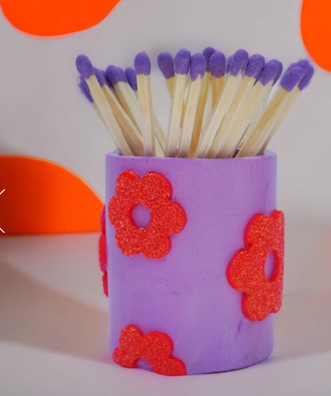 Enter these new GLITTER flower matchstick holders (with matches!). Each comes with a coordinated set of matches and a strike patch on the bottom.