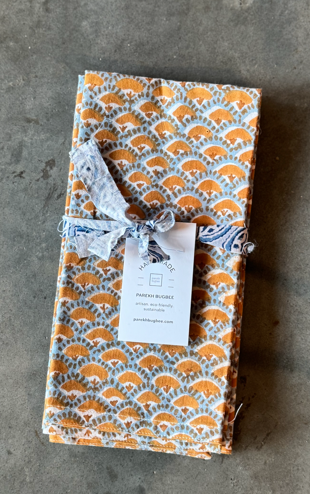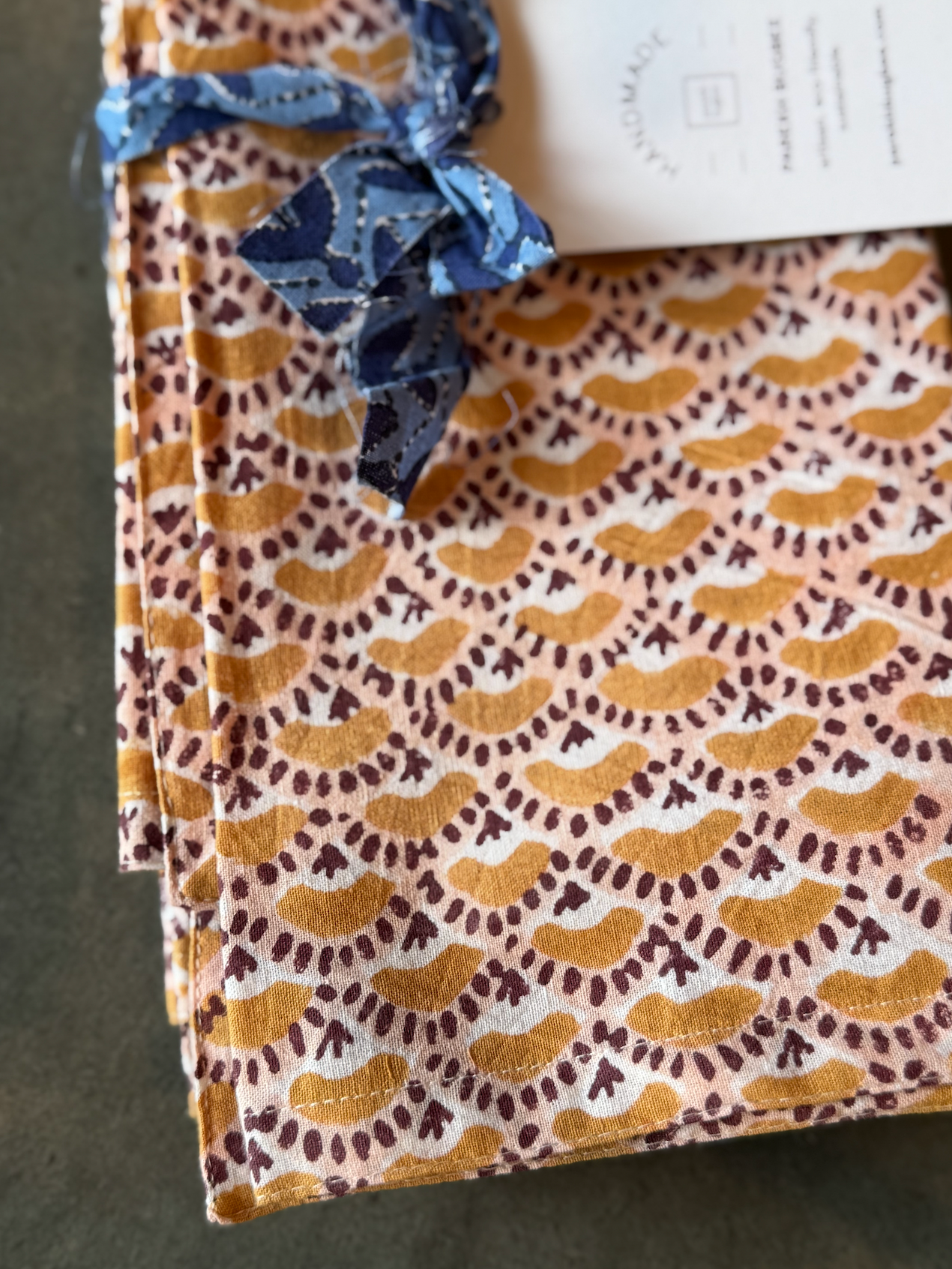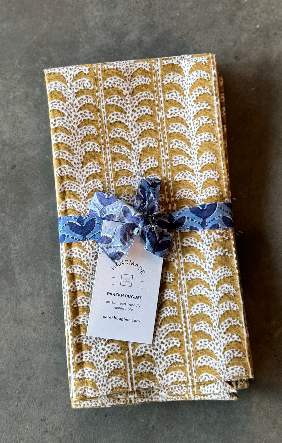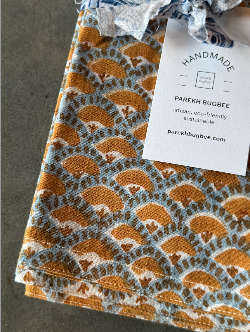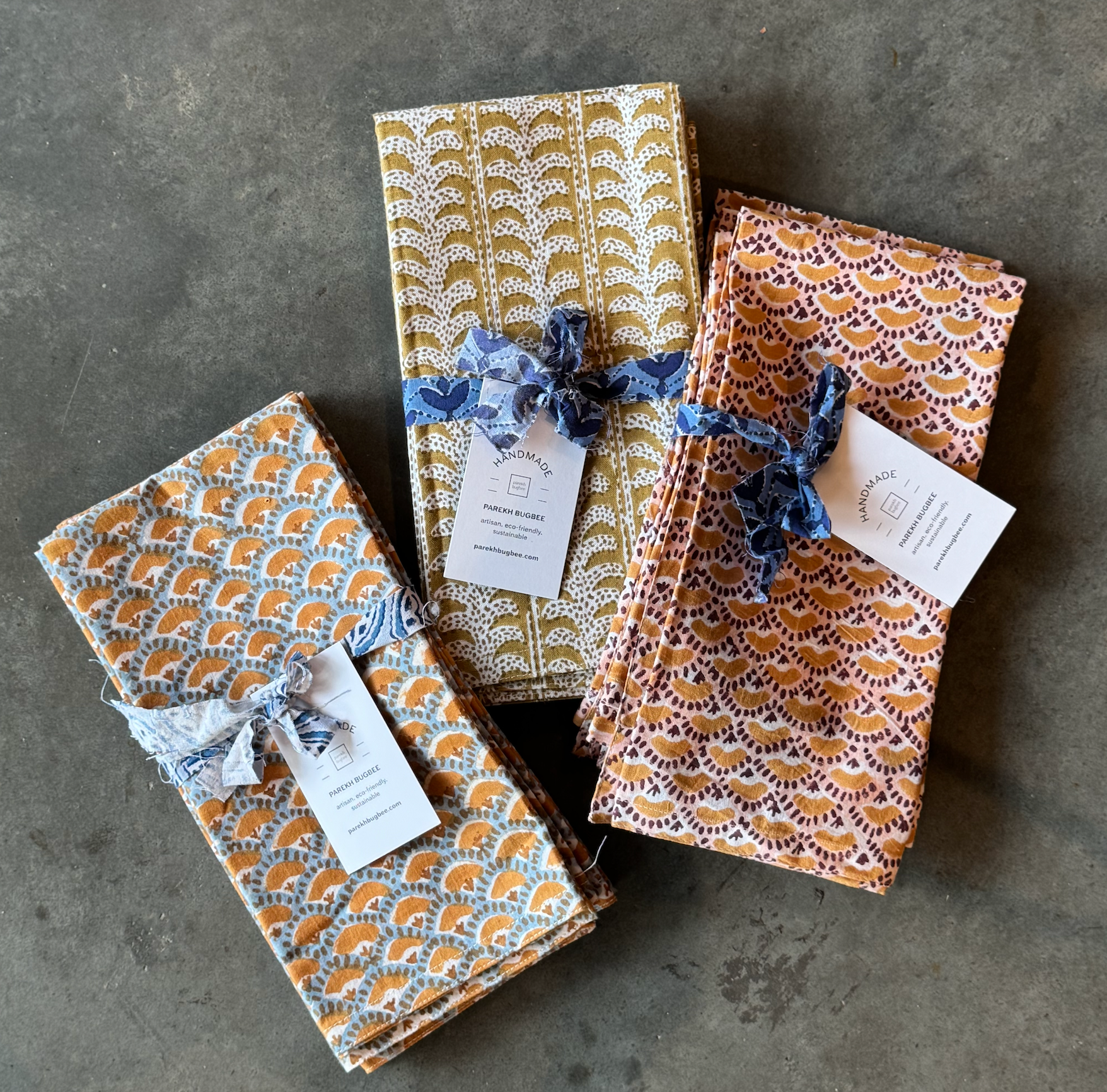 Hand block-printed by skilled artisans in our Parekh Bugbee's family factory in Mumbai. These gorgeous organic cotton napkins come in a set of four with self or contrast stitching. Great for daily use, they compliment any table setting and make the perfect gift for all food lovers who make every meal a celebration.