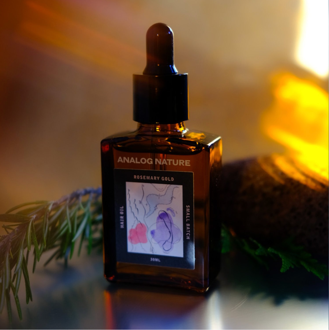 30 mL Hair Oil: A small-batch seasonal artisan blend inspired by increased hormonal hair loss in the winter. Feels like a golden massage on your head. This natural remedy combines 3 pure essential oils and 3 carrier oils to help with both dandruff and hair loss: Rosemary, Tea Tree, Cedarwood, Argan carrier, Jojoba carrier, Castor carrier. Simply massage into your head at night and wash out in the morning. Handmade in Oregon in limited batches of 50 bottles. Each blend comes in a handcrafted rose-dyed, 100% cotton bag by artisan María José Gómez. Label artwork by designer Cody Moore
