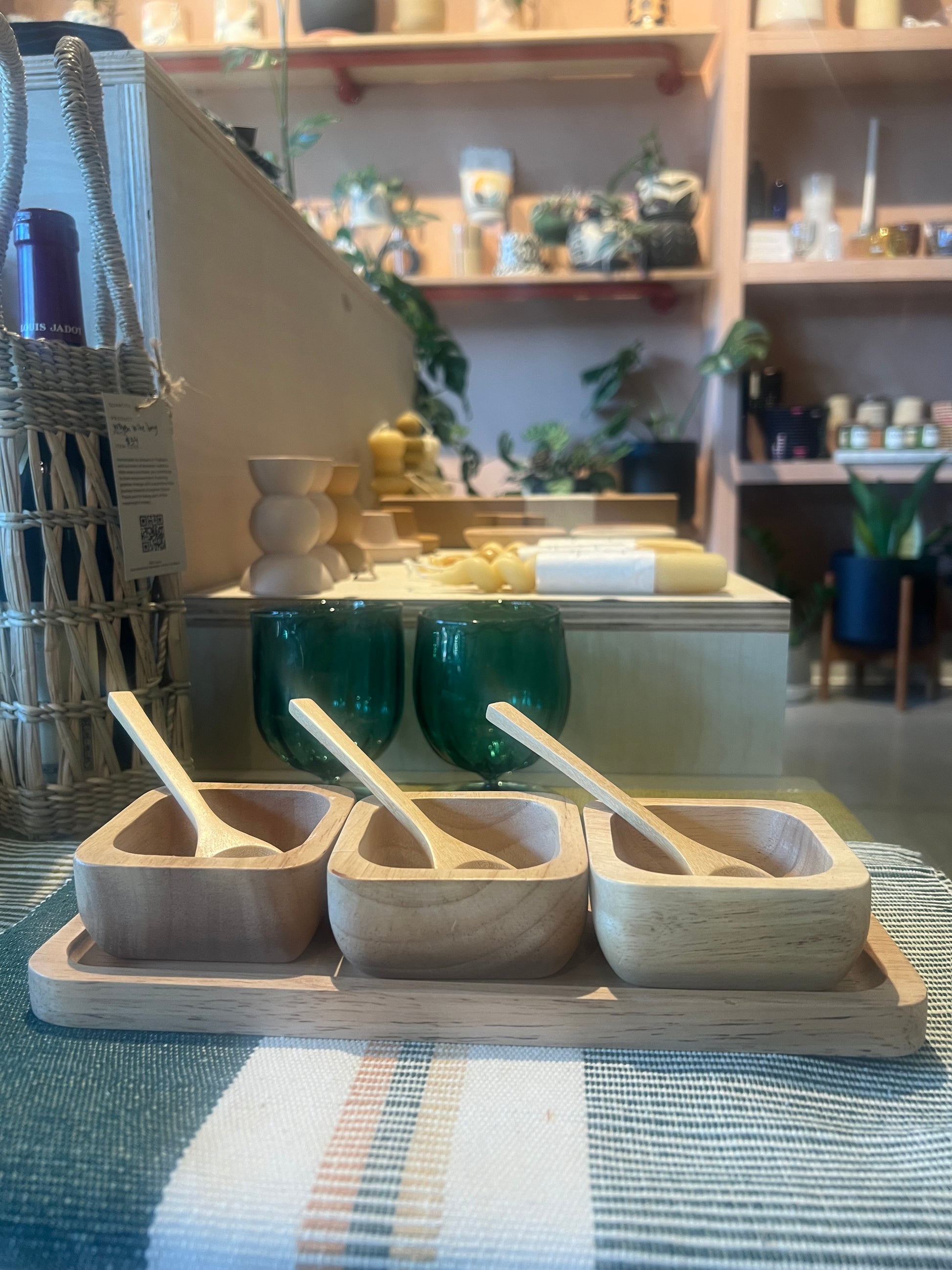 Made from sustainable sourced rubberwood, the set includes three square bowls and matching spoons,